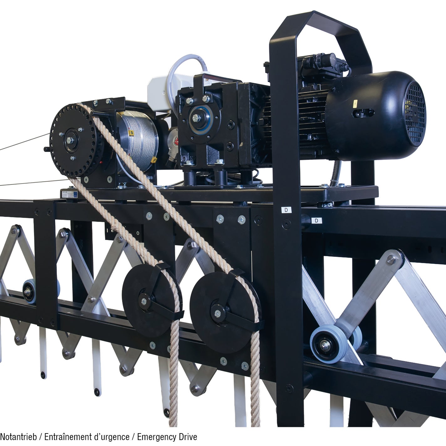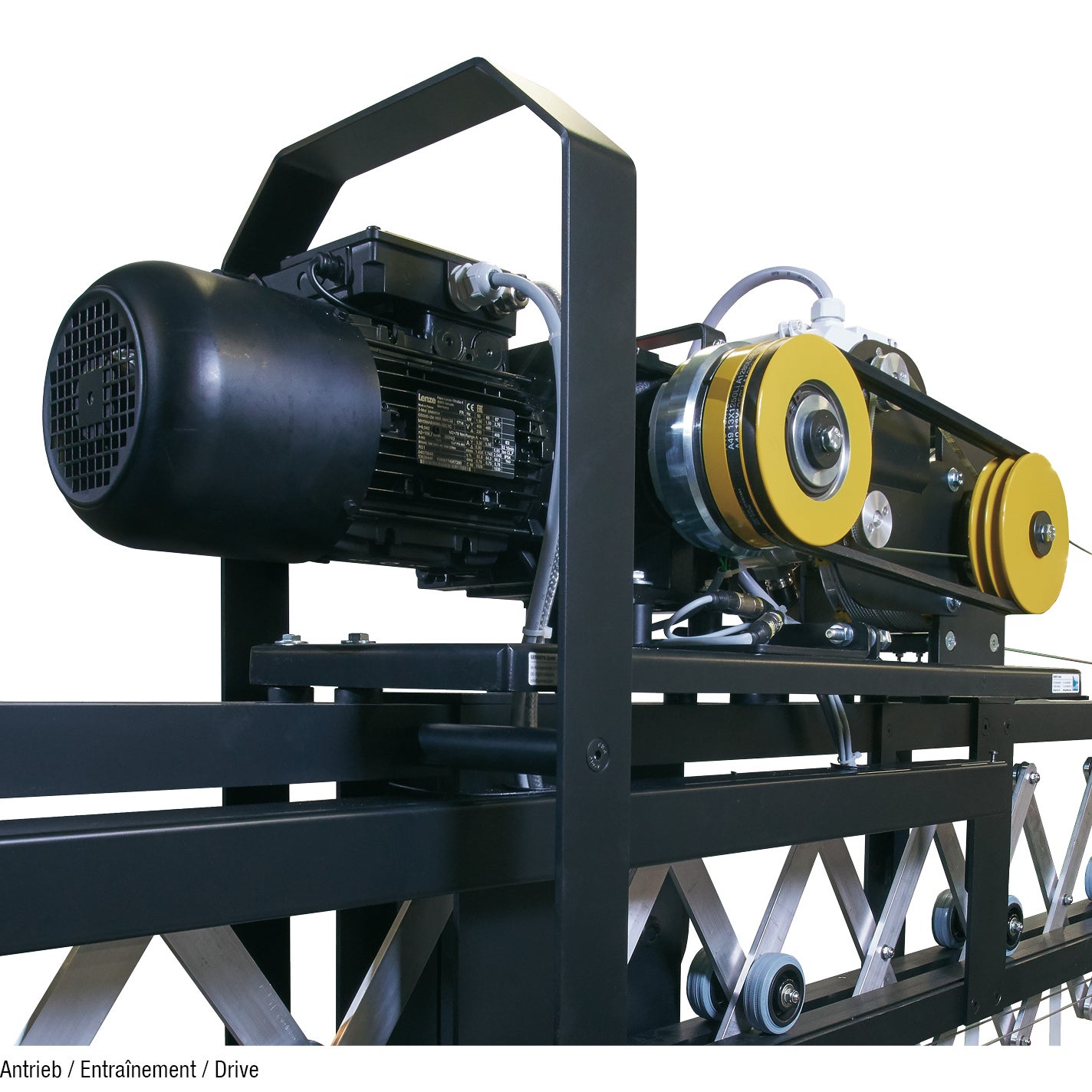 - Leistungsstarken Drehstrom-Getriebemotor mit Seiltrommelantrieb (griechisch) oder kompakter Treibscheibenantrieb (italienisch)